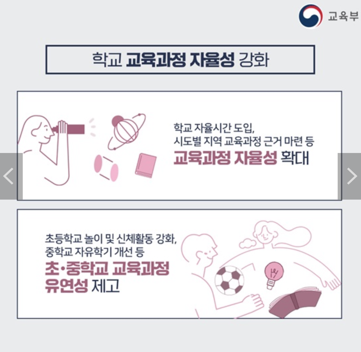지역 연계 및 학생의 필요를 고려한 선택 과목을 개발‧운영할 수 있도록 학교자율시간을 도입하고, 학교급 간 교과 교육과정 연계, 진로 설계 및 탐색 기회 제공, 학교 생활 적응을 지원하는 진로연계교육의 운영 근거를 마련하였다.