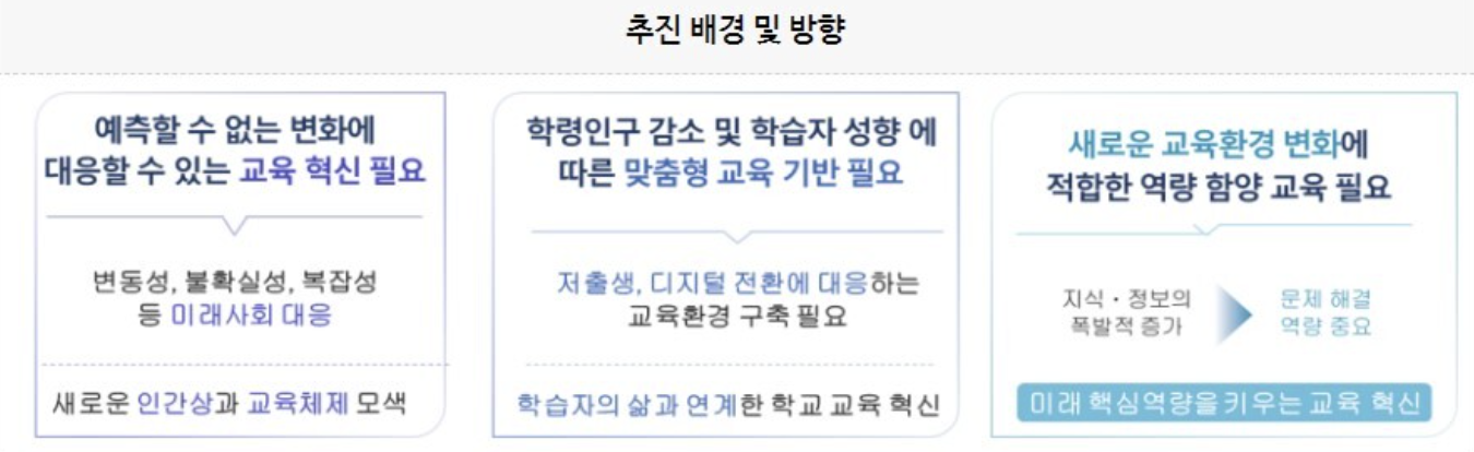 셋째, 학생들이 자신의 진로와 학습을 주도적으로 설계하고, 적절한 시기에 학습할 수 있도록 학습자 맞춤형 교육과정을 마련한다.
