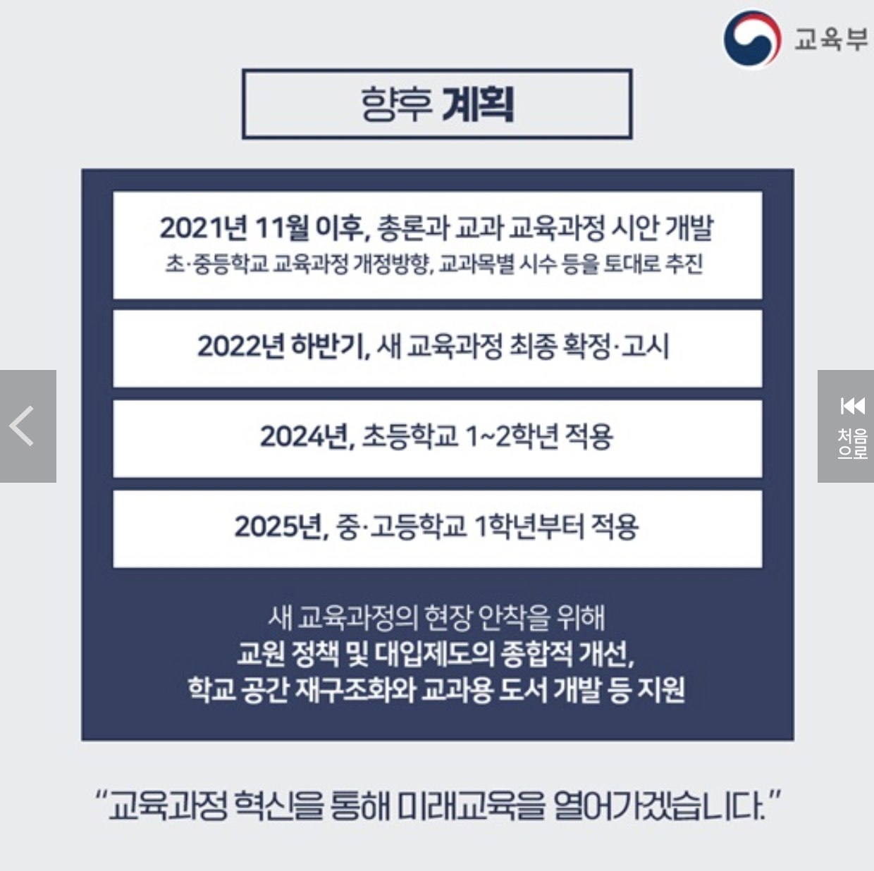 이번에 발표하는 ‘2022 개정 교육과정’은 2024년부터 초등학교 1~2학년, 2025년부터 중‧고등학교에 연차 적용한다. 교육과정 발표와 동시에 새 교육과정 취지에 맞는 교과용 도서 개발을 시작하고, 고교학점제 도입 및 교과목 구조 개편에 따라 현장 교원연수를 강화할 예정이다.