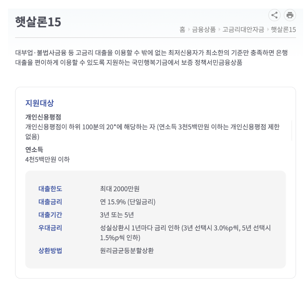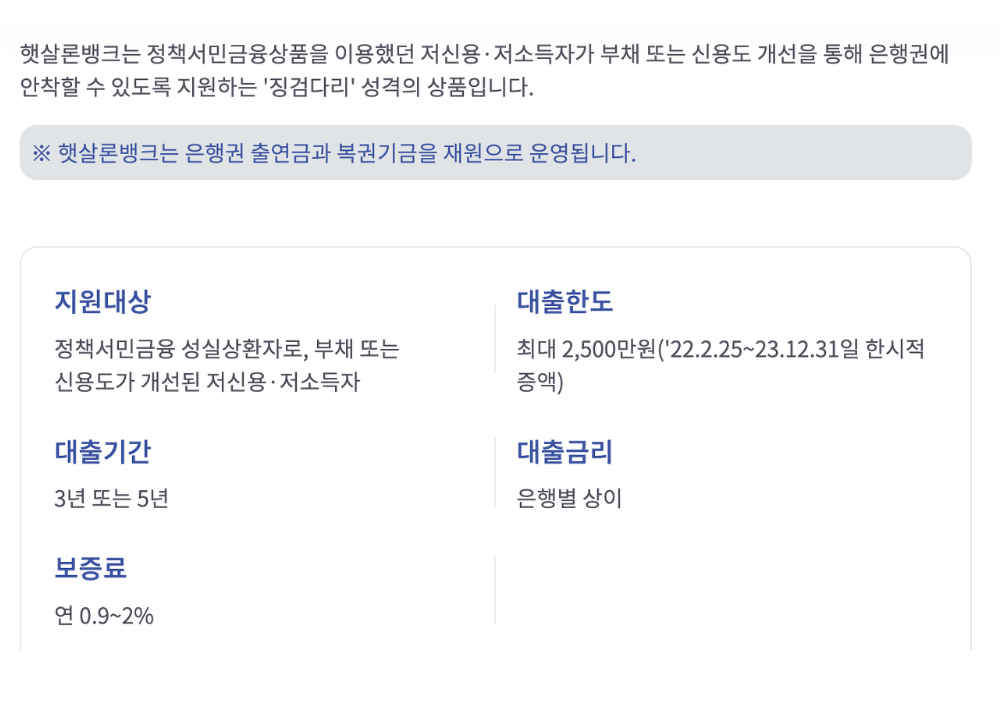 - 대부업, 불법사금융 등 고금리 대출을 이용할 수 밖에 없는 최저신용자가 최소한의 기준만 충족하면 은행대출을 이용할 수 있게 지원하는 국민 행복기금에서 보증하는 정책서민 금융상품으로 지원대상은 개인신용평점이 하우 100분의 20에 해당하는 분 (연소득 3,500만 원 이하 그리고 개인 신용평점제한은 없고) 연소득이 4,500만 원 이하 이면 최대 대출한도 2천만 원에 금리 연 15.9% 가능하며 대출기간은 최대 3~5년까지 가능하고 상환방법은 원리금 균등분할상환입니다.