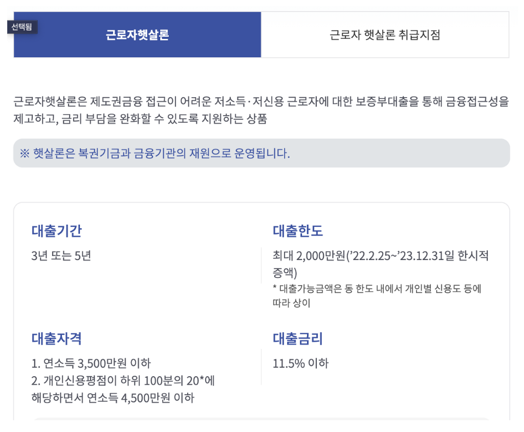 - 근로자 햇살론은 고금리대출을 이용하는 저신용 근로자와 소상공인을 대상으로 저금리 대출을 지원하는 서민금융상품입니다. 대출한도는 최대 2,000만 원, 대출 기간은 3~ 5년, 금리는 11.5% 이하입니다. 대출신청자격은 연소득 3,500만 원 이하, 신용등급 6등급 이하, 고금리대출 이용자입니다. 대출신청은 서민금융진흥원 누리집에서 온라인으로 신청가능합니다.