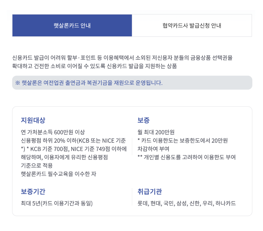 - 햇살론 카드는 신용카드사와 서민금융진흥원이 제휴하여 취약계층을 위해 출시한 신용카드입니다. 햇살론 카드는 신용카드사별로 다양한 혜택을 제공하고 있으며, 신용등급이 낮은 사람들도 이용할 수 있습니다.