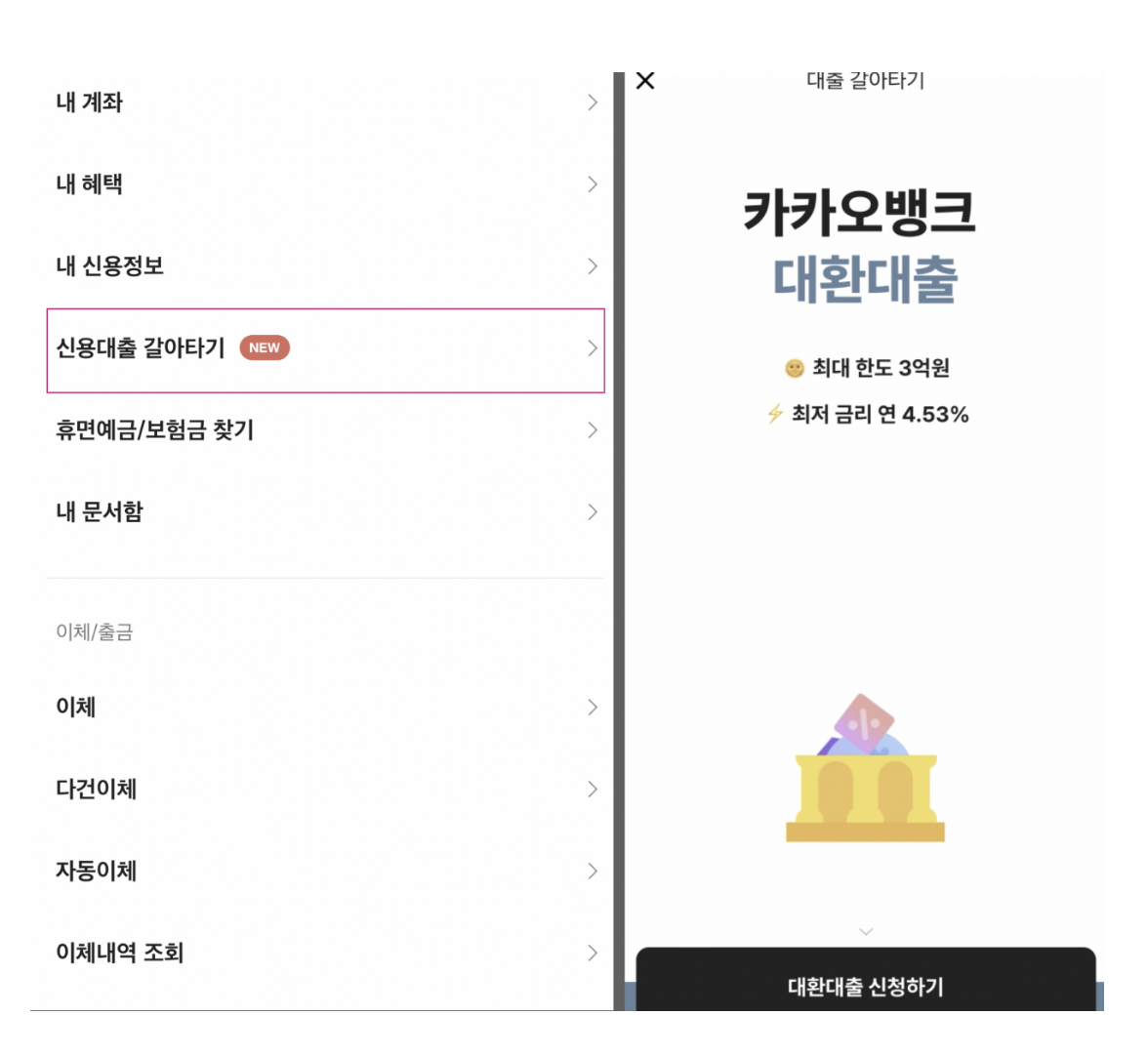 1. 내 매뉴 ->신용대출 갈아타기 메뉴가 신설된 걸 볼 수 있습니다.