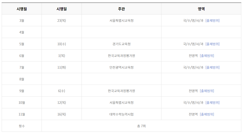 총 6번의 모의고사가 있으며, 그중 4번(3월, 5월, 7월, 10월)은 교육청이, 2번(6월, 9월)은 한국교육과정평가원이 주관합니다. 후자는 재수생도 볼 수 있습니다.